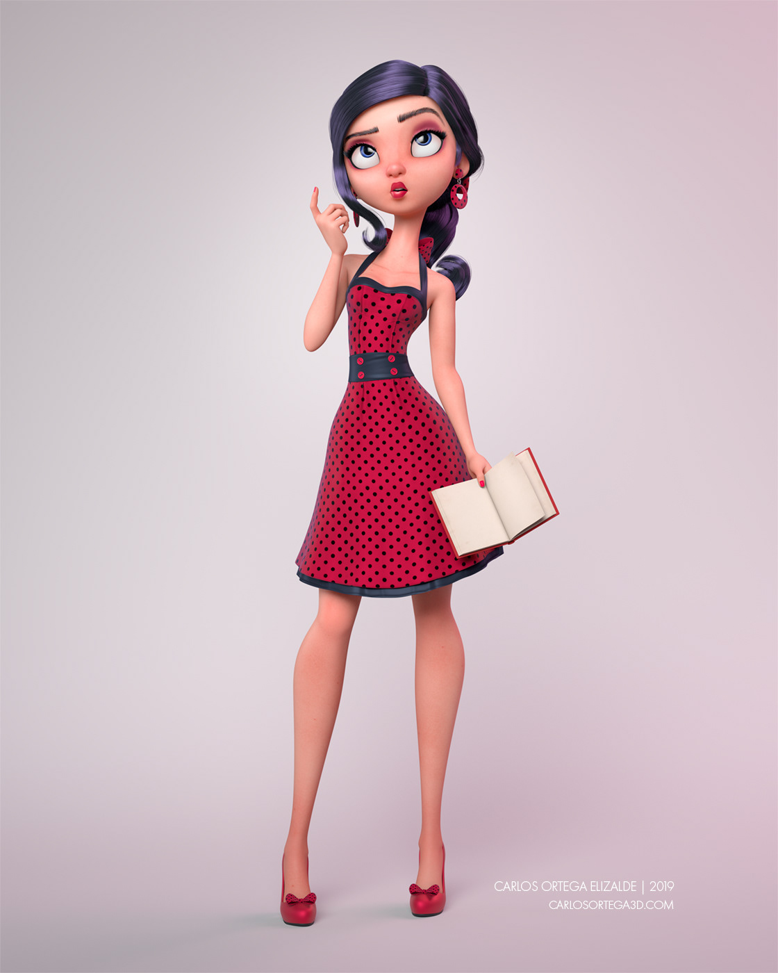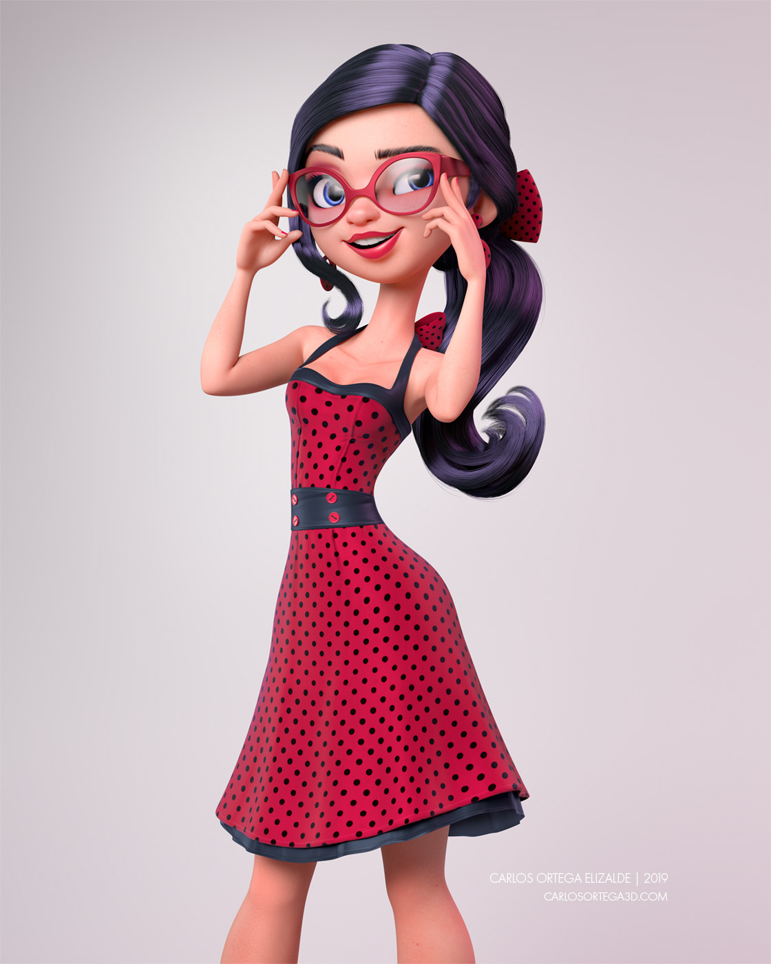 A "remake" I did last year. I did the original character back in 2012, inspired by some pinup outfits and dresses, and used it for presentations/slides in talks and workshops for a few years. Last year I wanted to print some postcards (it's a character I still like and landed me a few jobs) but the original renders were really bad and outdated (I never even dared to post them in my portfolio before) so I did a slight remake, mostly in look and silhouette, since topology is still not great.